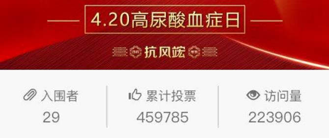 全國十大“抗風斗士”評選投票通道從4月20日開通以來,在全國各地引起了廣大醫(yī)生、風友、風友家屬的廣泛參與,掀起了投票熱潮。截止到4月26日晚17時,累計投票已近四十六萬票,投票平臺累計訪問人次超過二十二萬。